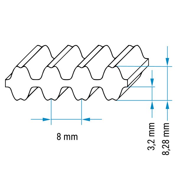 Standard-Antriebsriemen werden als geschlossene, breite Zahnwickel angeboten. Das bedeutet, dass der Zugstrang im Zahnriemen spiralförmig gewickelt und somit nicht unterbrochen ist. Dadurch kann der Riemen große Zugkräfte aufnehmen. Jeder Riemen wird auf die von Ihnen gewünschte Breite zugeschnitten. Die Fertigung erfolgt in Breiten von 200–800 mm. Bei der Länge stehen Ihnen vorgegebene Maße zur Auswahl.