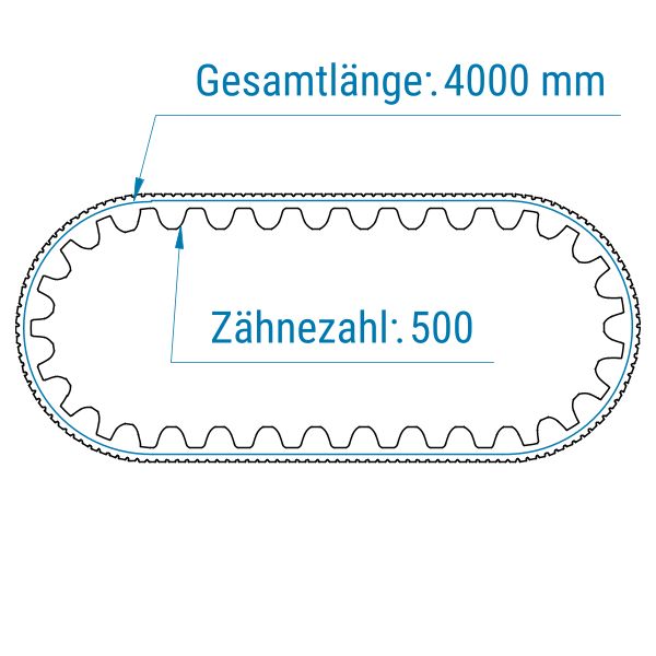 Standard-Antriebsriemen werden als geschlossene, breite Zahnwickel angeboten. Das bedeutet, dass der Zugstrang im Zahnriemen spiralförmig gewickelt und somit nicht unterbrochen ist. Dadurch kann der Riemen große Zugkräfte aufnehmen. Jeder Riemen wird auf die von Ihnen gewünschte Breite zugeschnitten. Die Fertigung erfolgt in Breiten von 200–800 mm. Bei der Länge stehen Ihnen vorgegebene Maße zur Auswahl.