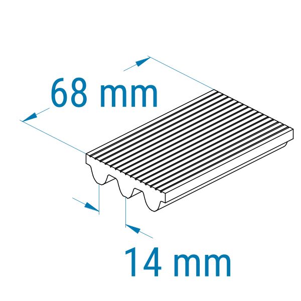 Das PC2 14MGT-Profil hat eine abgerundete Zahnform mit abgeflachter Zahnspitze. Polychain-Zahnriemen müssen unbedingt mit Polychain-Zahnriemenscheiben betrieben werden. Des Weiteren haben Polychain-Riemen kleine Querstreben auf dem Riemenrücken zur Optimierung der Querstabilität. Die Profilbezeichnung zeigt die Teilung (Abstand von Zahnmitte zu Zahnmitte, z. B. 8MGT = 8 mm, 14MGT = 14 mm, ...) an. Die Teilung beträgt somit 14 mm.