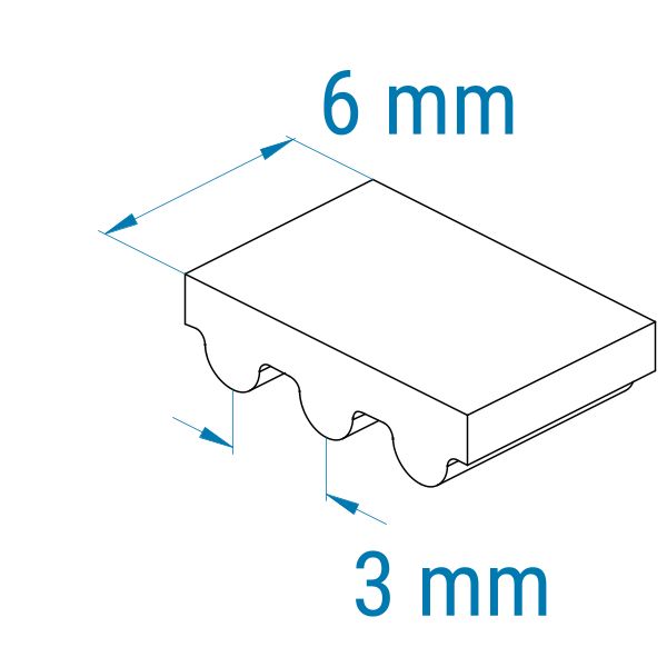 Das 3MGT-Profil verfügt über eine halbrunde Zahnform und ist dem HTD-Profil sehr ähnlich. 3MGT und 5MGT können die höhere Leistung nur mit den originalen Gates MR-Zahnriemenscheiben entfalten. 8MGT- und 14MGT-Zahnriemen werden hingegen in normalen 8M- bzw. 14M-Zahnriemenscheiben (HTD) betrieben. Das 3MGT-Profil zeigt die Teilung von 3 mm an. Die Teilung ist hierbei der Abstand von Zahnmitte zu Zahnmitte und beträgt 3 mm. Diese Riemen sind speziell verstärkt und haben eine hohe Positionsgenauigkeit.