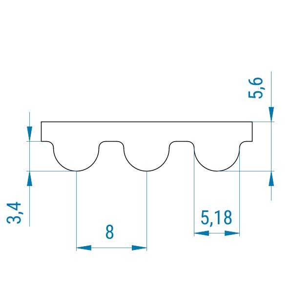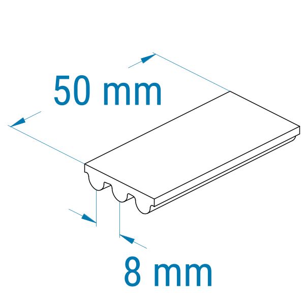 Das 8MGT-Profil verfügt über eine halbrunde Zahnform und ist dem HTD-Profil sehr ähnlich. 3MGT und 5MGT können die höhere Leistung nur mit den originalen Gates MR-Zahnriemenscheiben entfalten. 8MGT- und 14MGT-Zahnriemen werden hingegen in normalen 8M- bzw. 14M-Zahnriemenscheiben (HTD) betrieben. Das 8MGT-Profil zeigt die Teilung von 8 mm an. Die Teilung ist hierbei der Abstand von Zahnmitte zu Zahnmitte und beträgt 8 mm. Diese Riemen sind speziell verstärkt und haben eine hohe Positionsgenauigkeit.