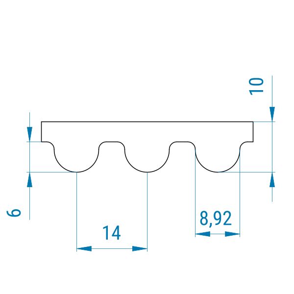 Das 14MGT-Profil verfügt über eine halbrunde Zahnform und ist dem HTD-Profil sehr ähnlich. 3MGT und 5MGT können die höhere Leistung nur mit den originalen Gates MR-Zahnriemenscheiben entfalten. 8MGT- und 14MGT-Zahnriemen werden hingegen in normalen 8M- bzw. 14M-Zahnriemenscheiben (HTD) betrieben. Das 14MGT-Profil zeigt die Teilung von 14 mm an. Die Teilung ist hierbei der Abstand von Zahnmitte zu Zahnmitte und beträgt 14 mm. Diese Riemen sind speziell verstärkt und haben eine hohe Positionsgenauigkeit.