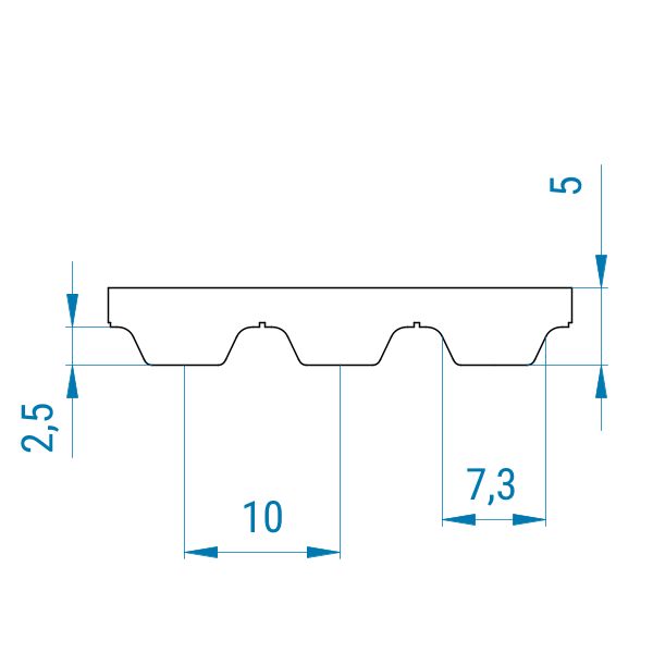 Das AT10-Profil ist trapezförmig. Der Zahn ist bei diesen Riemen wesentlich größer als die Zahnlücke. Aus diesem Grund können sie nicht auf so kleine Umlenkradien umgelenkt werden wie Riemen mit einem T-Profil. Der Abstand von Zahnmitte zu Zahnmitte beträgt bei dem AT10-Profil 10 mm.