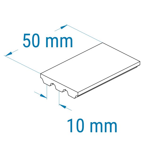 Standard-Antriebsriemen werden als geschlossene, breite Zahnwickel angeboten. Das bedeutet, dass der Zugstrang im Zahnriemen spiralförmig gewickelt und somit nicht unterbrochen ist. Dadurch kann der Riemen große Zugkräfte aufnehmen. Jeder Riemen wird auf die von Ihnen gewünschte Breite zugeschnitten. Die Fertigung erfolgt in Breiten von 200–800 mm. Bei der Länge stehen Ihnen vorgegebene Maße zur Auswahl.