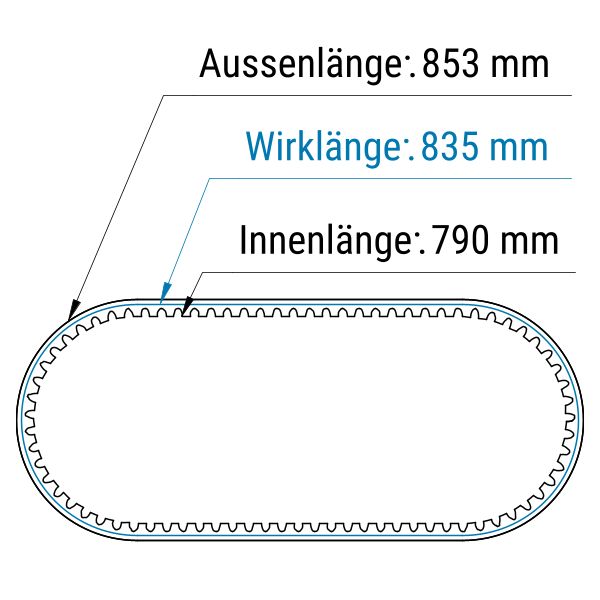 Keilriemen können mit drei Längen angegeben werden: Innenlänge (LI), Außenlänge (LA) und Wirklänge (LW).