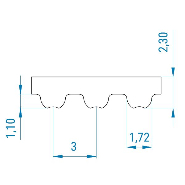 Zahn und Zahnlücke sind nahezu gleich groß. Das 3M-Profil zeigt die Teilung von 3 mm an. Die Teilung ist hierbei der Abstand von Zahnmitte zu Zahnmitte und beträgt 3 mm.