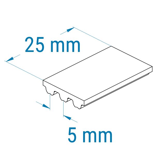 Zahn und Zahnlücke sind nahezu gleich groß. Das 5M-Profil zeigt die Teilung von 5 mm an. Die Teilung ist hierbei der Abstand von Zahnmitte zu Zahnmitte und beträgt 5 mm.