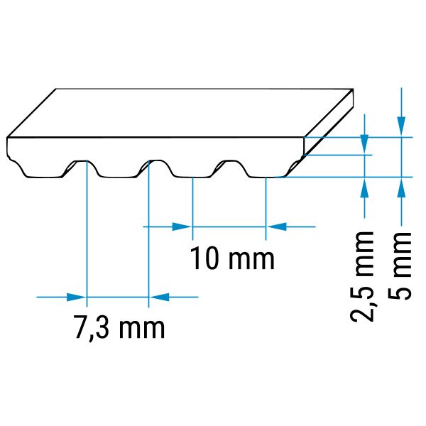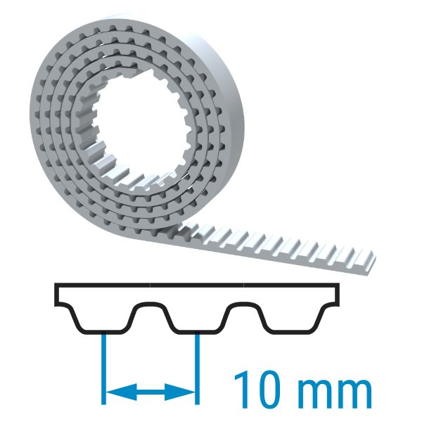 Das Profil eines Zahnriemens gibt Form, Größe und Abstand der Zähne an. Beide hier angebotenen Zahnriemen haben 10 mm Abstand von Zahnmitte zu Zahnmitte.