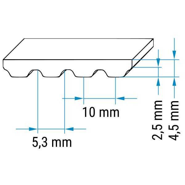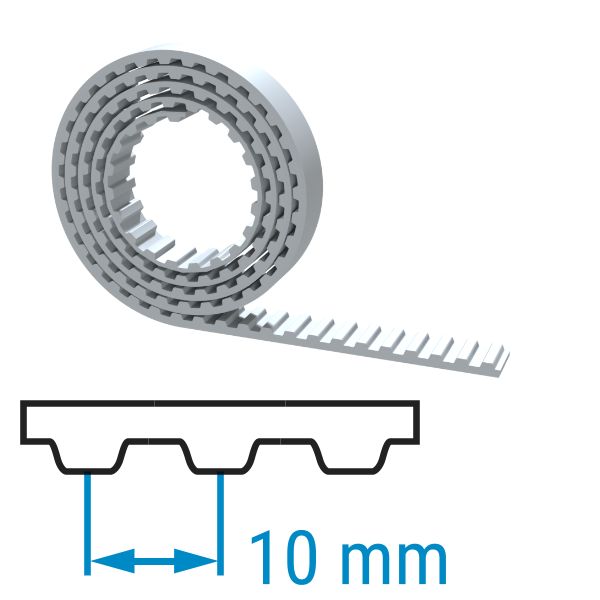 Das Profil eines Zahnriemens gibt Form, Größe und Abstand der Zähne an. Beide hier angebotenen Zahnriemen haben 10 mm Abstand von Zahnmitte zu Zahnmitte.