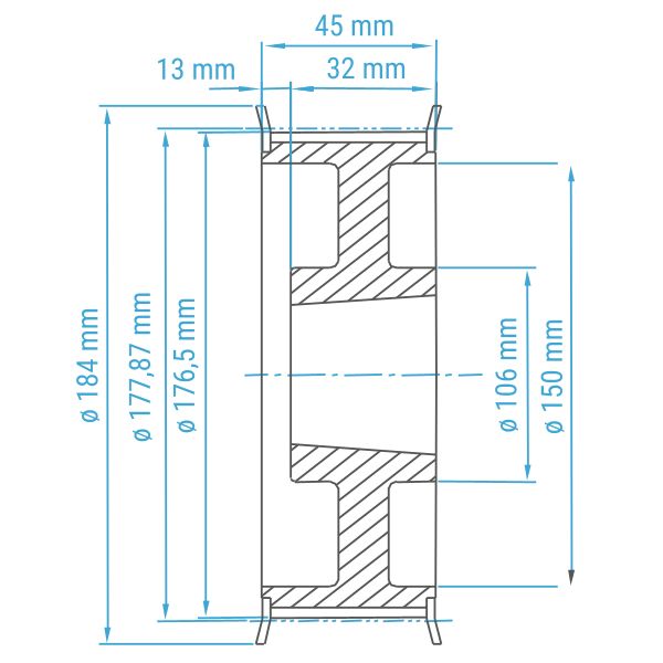Zahnriemenscheiben mit dem Profil H werden bis zu 48 Zähnen aus Stahl und ab 50 Zähnen aus Grauguss gefertigt.