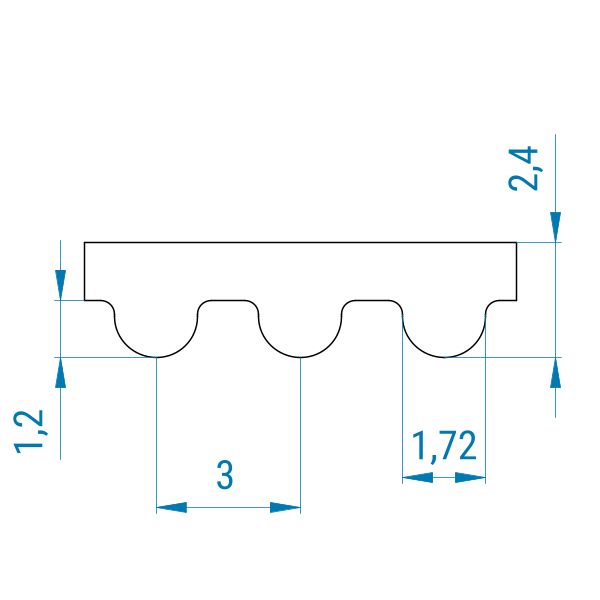Die Zahnform ist hier halbrund (HTD). Das HTD-Profil läuft selbstverständlich auch in HTD-Zahnriemenscheiben. Zahn und Zahnlücke sind nahezu gleich groß. Das 3M (HTD)-Profil zeigt die Teilung von 3 mm an. Die Teilung ist hierbei der Abstand von Zahnmitte zu Zahnmitte und beträgt 3 mm.