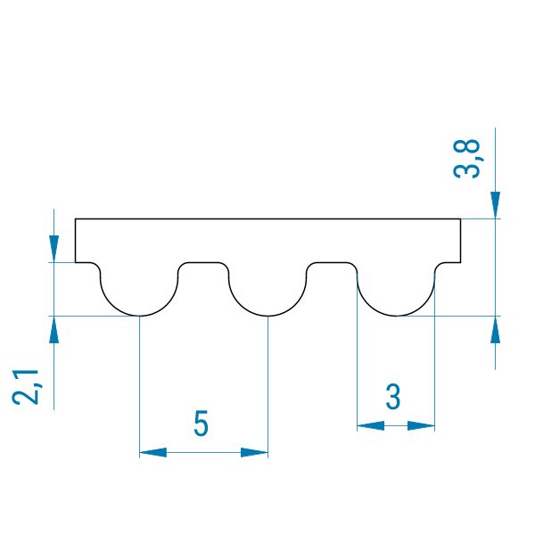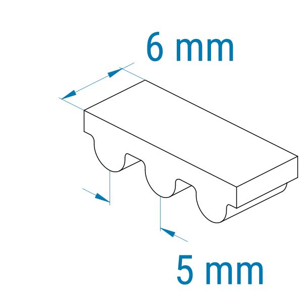 Die Zahnform ist hier halbrund (HTD). Das HTD-Profil läuft selbstverständlich auch in HTD-Zahnriemenscheiben. Zahn und Zahnlücke sind nahezu gleich groß. Das 5M (HTD)-Profil zeigt die Teilung von 5 mm an. Die Teilung ist hierbei der Abstand von Zahnmitte zu Zahnmitte und beträgt 5 mm.