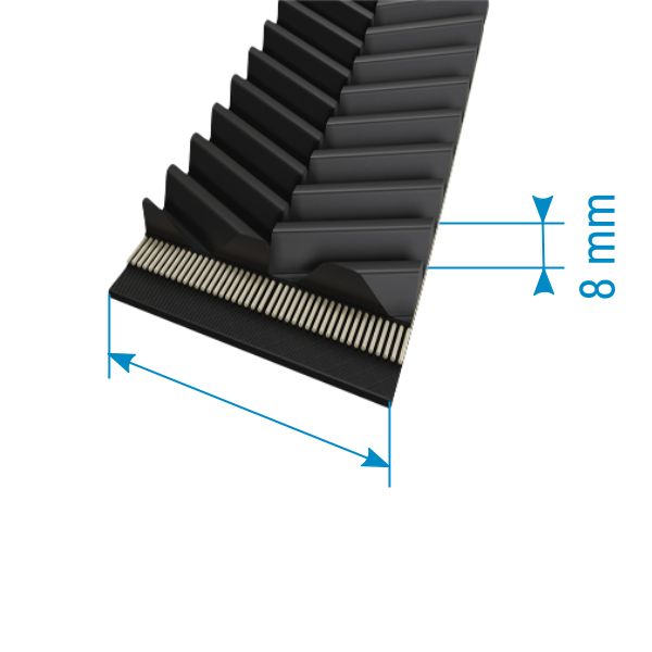 Standard-Antriebsriemen werden als geschlossene, breite Zahnwickel angeboten. Das bedeutet, dass der Zugstrang im Zahnriemen spiralförmig gewickelt und somit nicht unterbrochen ist. Dadurch kann der Riemen große Zugkräfte aufnehmen. Jeder Riemen wird auf die von Ihnen gewünschte Breite zugeschnitten. Die Fertigung erfolgt in Breiten von 200–800 mm. Bei der Länge stehen Ihnen vorgegebene Maße zur Auswahl.