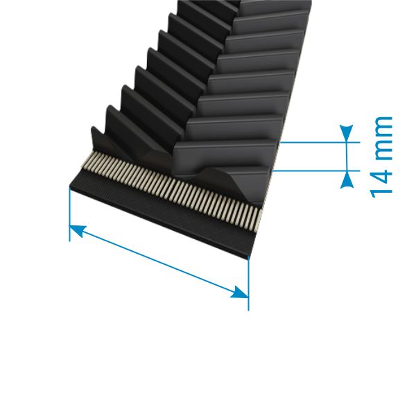 Standard-Antriebsriemen werden als geschlossene, breite Zahnwickel angeboten. Das bedeutet, dass der Zugstrang im Zahnriemen spiralförmig gewickelt und somit nicht unterbrochen ist. Dadurch kann der Riemen große Zugkräfte aufnehmen. Jeder Riemen wird auf die von Ihnen gewünschte Breite zugeschnitten. Die Fertigung erfolgt in Breiten von 200–800 mm. Bei der Länge stehen Ihnen vorgegebene Maße zur Auswahl.