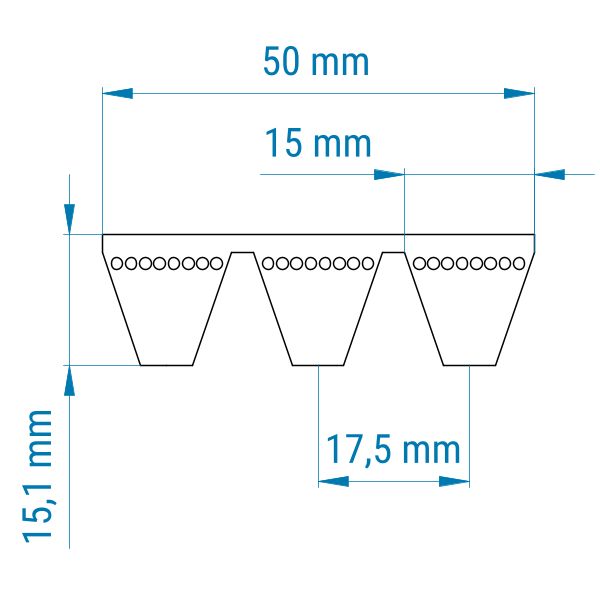 Profil: 5V | 3 Rippen (Zuschnitt) | Gesamtbreite: ca. 50 mm | Höhe: 15,1 mm | Länge: 2540 mm (La)