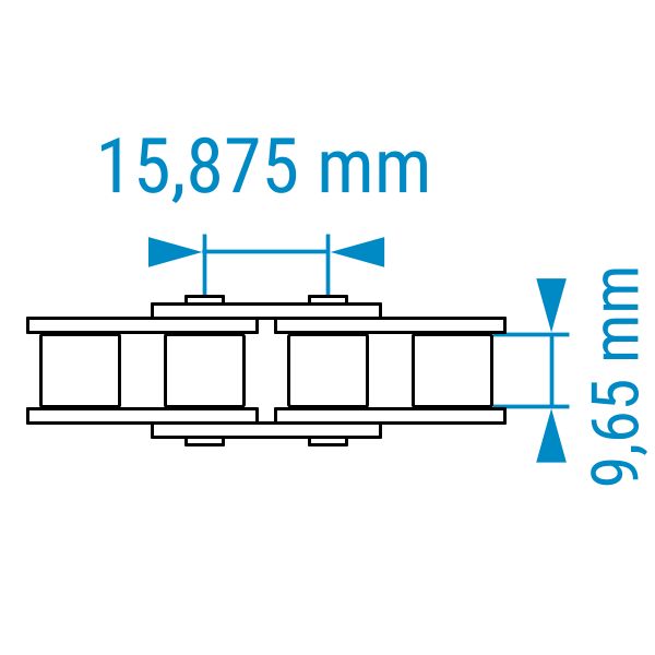 Teilung 15,875 mm von Bolzen zu Bolzen und Rollenbreite 9,65 mm.