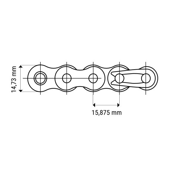 Teilung 15,875 mm von Bolzen zu Bolzen und Rollenbreite 9,65 mm.