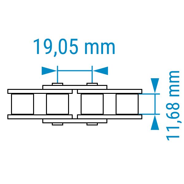 Teilung 19,05 mm von Bolzen zu Bolzen und Rollenbreite 11,68 mm.