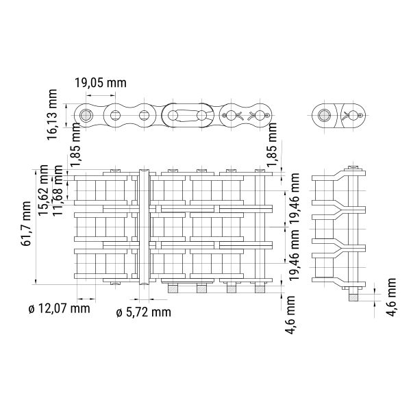 Teilung 19,05 mm von Bolzen zu Bolzen und Rollenbreite 11,68 mm.