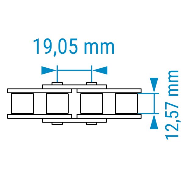 Teilung 19,05 mm von Bolzen zu Bolzen und Rollenbreite 12,57 mm.