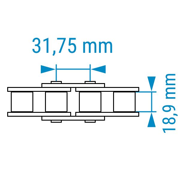 Teilung 31,75 mm von Bolzen zu Bolzen und Rollenbreite 18,9 mm.