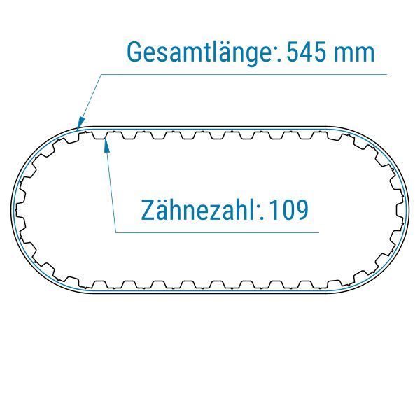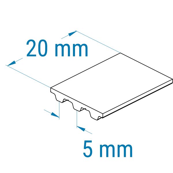 Profil: T5 | 109 Zähne | Teilung: 5 mm | Länge: 545 mm | Breite: 20 mm (Zuschnitt) | PU (Polyurethan)-Zahnriemen mit Stahl-Zugträgern | geschlossen gefertigt