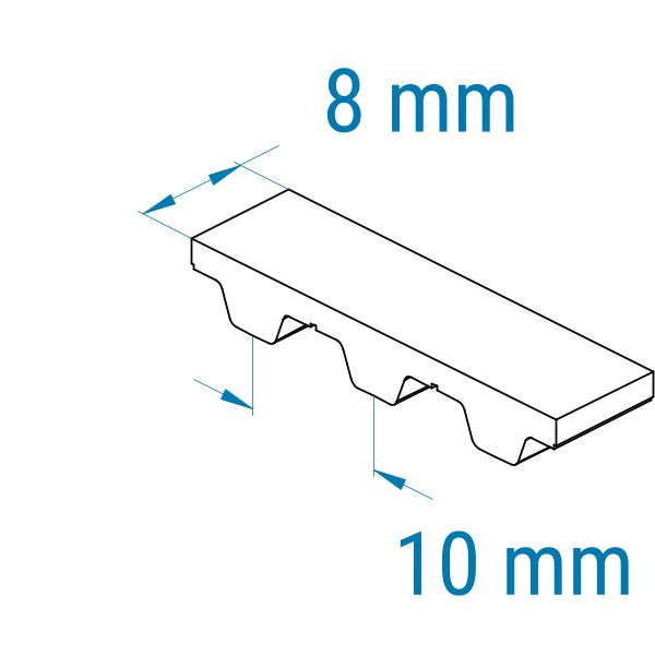 Profil: T10 | 60 Zähne | Teilung: 10 mm | Länge: 600 mm | Breite: 8 mm (Zuschnitt) | PU (Polyurethan)-Zahnriemen mit Stahl-Zugträgern | geschlossen gefertigt