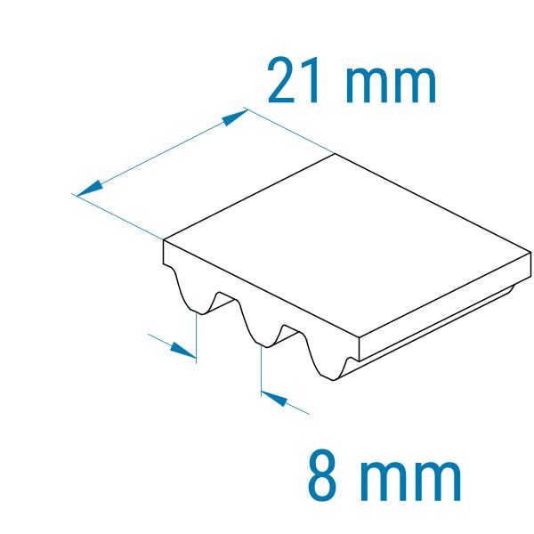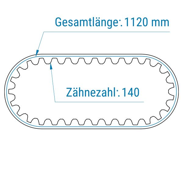 Profil: C8M | 140 Zähne | Teilung: 8 mm | Länge: 1120 mm | Breite: 21 mm (Zuschnitt) | PU (Polyurethan)-Zahnriemen mit Carbon-Zugträgern | geschlossen gefertigt