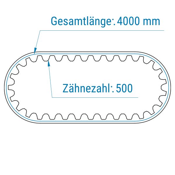 Profil: C8M | 500 Zähne | Teilung: 8 mm | Länge: 4000 mm | Breite: 21 mm (Zuschnitt) | PU (Polyurethan)-Zahnriemen mit Carbon-Zugträgern | geschlossen gefertigt