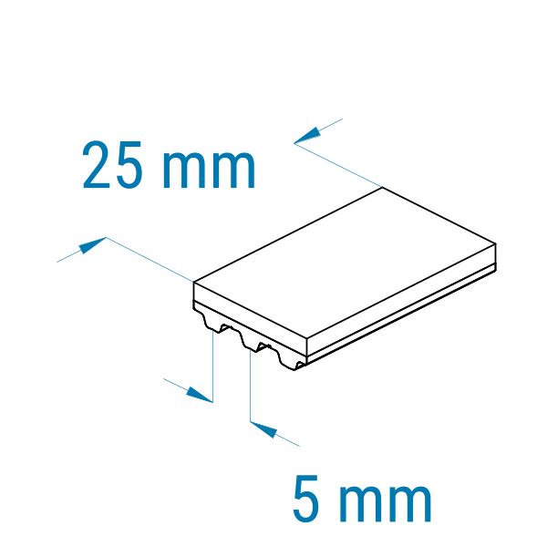 Profil: T5 | Breite: 25 mm | Mitnahme: hoch | Oberfläche: rau | Abriebfestigkeit: niedrig | für Führen, Zentrieren, Anpressen, Etiketten