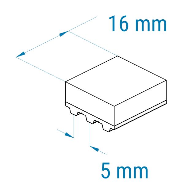 Profil: T5 | Breite: 16 mm | Mitnahme: hoch | Oberfläche: rau | Abriebfestigkeit: niedrig | für Führen, Zentrieren, Anpressen, Etiketten