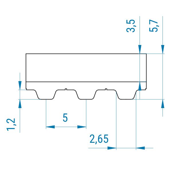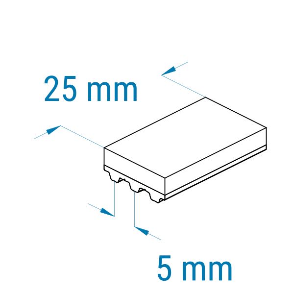Profil: T5 | Breite: 25 mm | Mitnahme: hoch | Oberfläche: Struktur, grob | Abriebfestigkeit: mittel | für Holz, Kunststoffkästen, Kartonagen