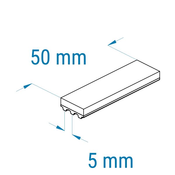 Profil: T5 | Breite: 50 mm | Mitnahme: hoch | Oberfläche: Struktur, grob | Abriebfestigkeit: mittel | für Holz, Kunststoffkästen, Kartonagen