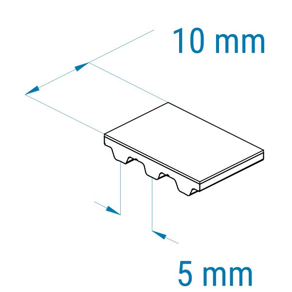 Profil: T5 | Breite: 10 mm | Mitnahme: gering | Oberfläche: Struktur, fein | Abriebfestigkeit: mittel-hoch | für Doppelgurtförderer, Stauförderer, Glas, Metall