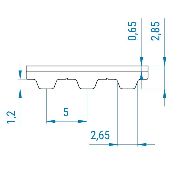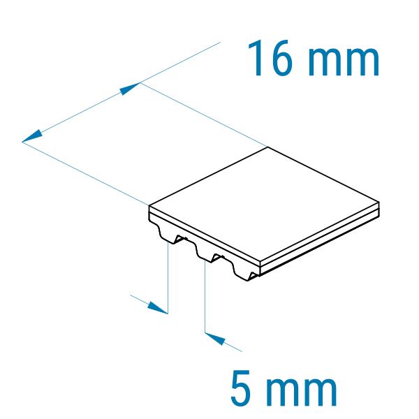 Profil: T5 | Breite: 16 mm | Mitnahme: gering | Oberfläche: Struktur, fein | Abriebfestigkeit: mittel-hoch | für Doppelgurtförderer, Stauförderer, Glas, Metall