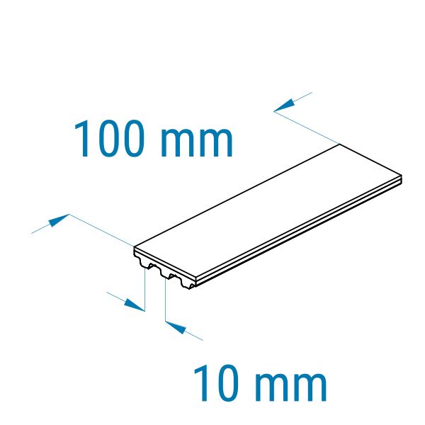 Profil: T10 | Breite: 100 mm | Mitnahme: gering | Oberfläche: Struktur, fein | Abriebfestigkeit: hoch | für Lebensmittel, Teigwaren, Verpackung | für Lebensmittel geeignet nach FDA oder EU10/2011