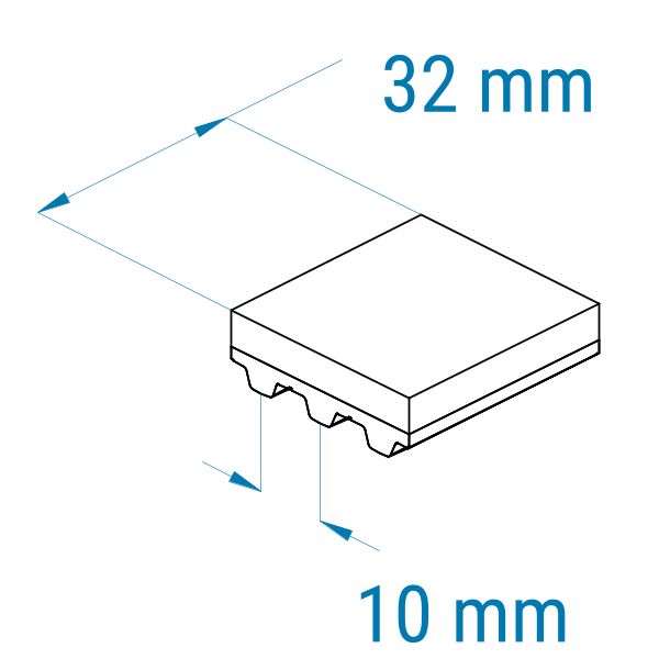 Profil: T10 | Breite: 32 mm | Mitnahme: hoch | Oberfläche: rau | Abriebfestigkeit: niedrig | für Führen, Zentrieren, Anpressen, Etiketten