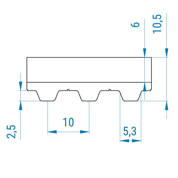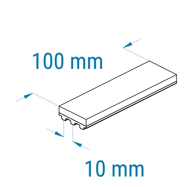 Profil: T10 | Breite: 100 mm | Mitnahme: hoch | Oberfläche: rau | Abriebfestigkeit: niedrig | für Führen, Zentrieren, Anpressen, Etiketten