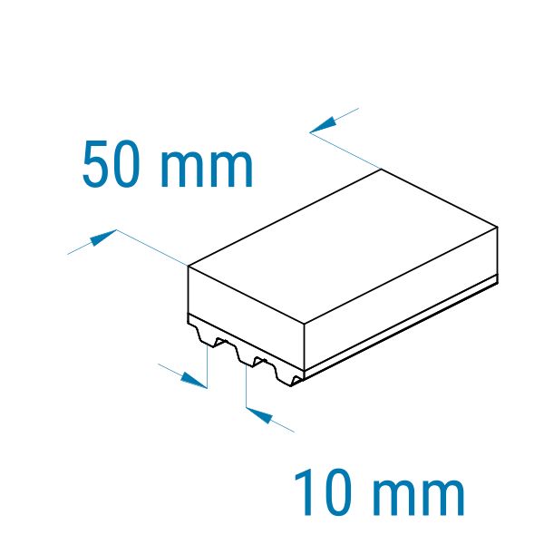 Profil: T10 | Breite: 50 mm | Mitnahme: hoch | Oberfläche: glatt | Abriebfestigkeit: mittel-hoch | für empfindliche Teile, Verpackungen, Kartonagen, Führen, Anpressen