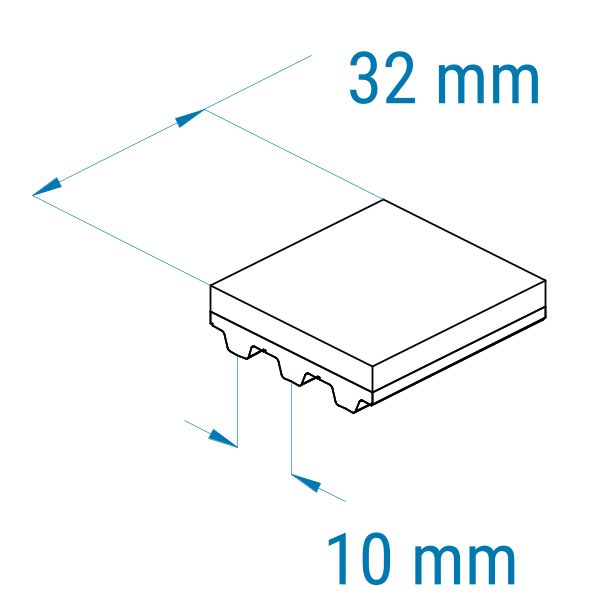 Profil: T10 | Breite: 32 mm | Mitnahme: hoch | Oberfläche: glatt | Abriebfestigkeit: mittel-hoch | für empfindliche Teile, Verpackungen, Kartonagen, Führen, Anpressen