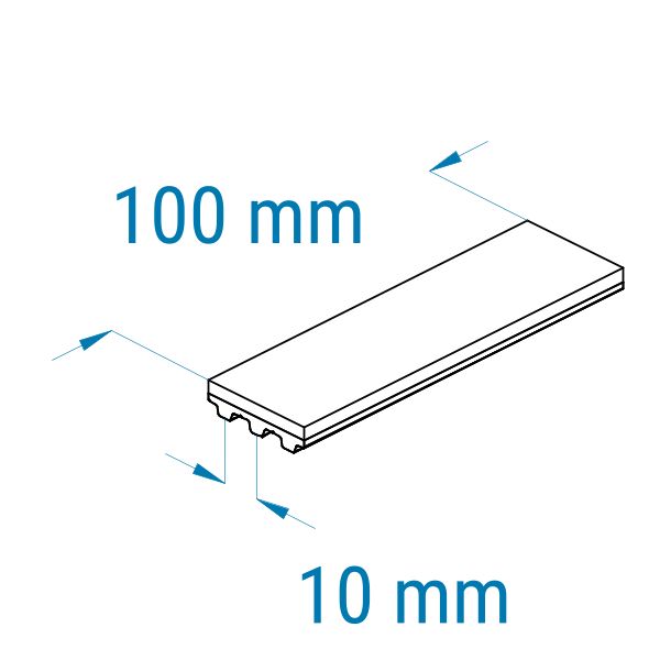 Profil: T10 | Breite: 100 mm | Mitnahme: hoch | Oberfläche: Struktur, grob | Abriebfestigkeit: mittel | für Holz, Kunststoffkästen, Kartonagen