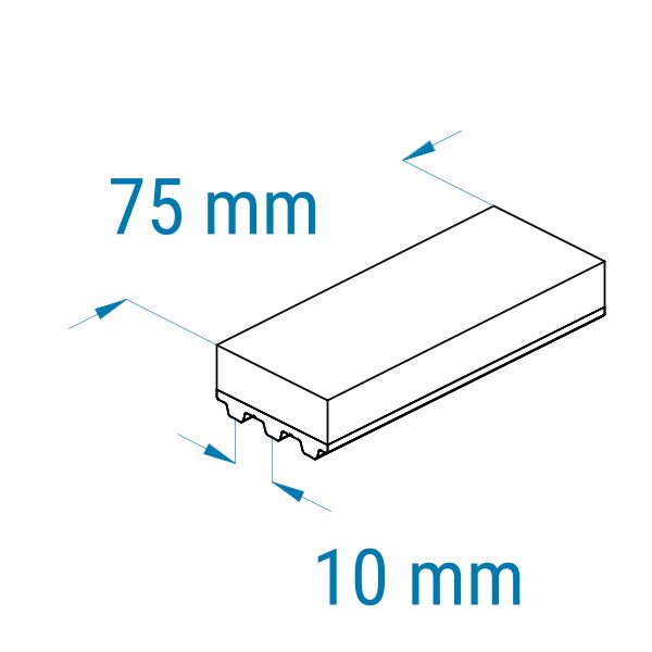 Profil: T10 | Breite: 75 mm | Mitnahme: hoch | Oberfläche: glatt | Abriebfestigkeit: niedrig | für Führen, Zentrieren, Anpressen, Etiketten