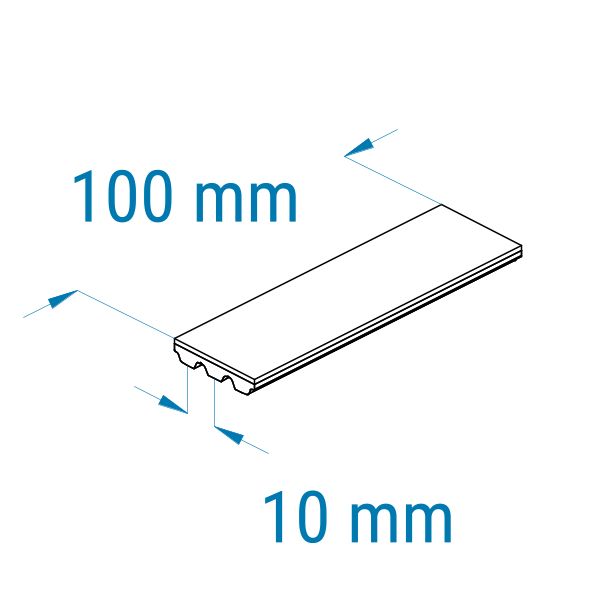 Profil: AT10 | Breite: 100 mm | Mitnahme: hoch | Oberfläche: Struktur, grob | Abriebfestigkeit: mittel | für Nasstransport, Lebensmittel, Kunststoffverpackungen