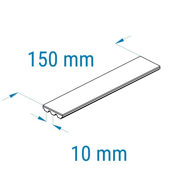 Profil: AT10 | Breite: 150 mm | Mitnahme: hoch | Oberfläche: Struktur, grob | Abriebfestigkeit: mittel | für Nasstransport, Lebensmittel, Kunststoffverpackungen