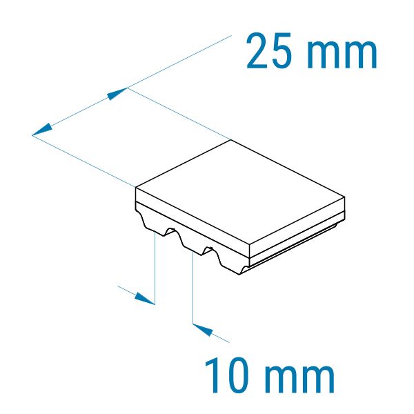 Profil: AT10 | Breite: 25 mm | Mitnahme: hoch | Oberfläche: Struktur, grob | Abriebfestigkeit: hoch | für Lebensmittel, Fleisch-, Wurstverarbeitung, Gefriergut | für Lebensmittel geeignet nach FDA oder EU10/2011