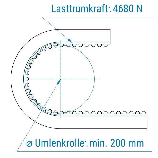 Profil: 5M (HTD) | Breite: 50 mm | Mitnahme: hoch | Oberfläche: rau | Abriebfestigkeit: niedrig | für Führen, Zentrieren, Anpressen, Etiketten