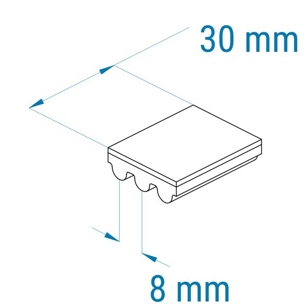 Profil: 8M (HTD) | Breite: 30 mm | Mitnahme: hoch | Oberfläche: Struktur, fein | Abriebfestigkeit: mittel | für Holz, Kunststoffkästen, Kartonagen, Gibtskarton