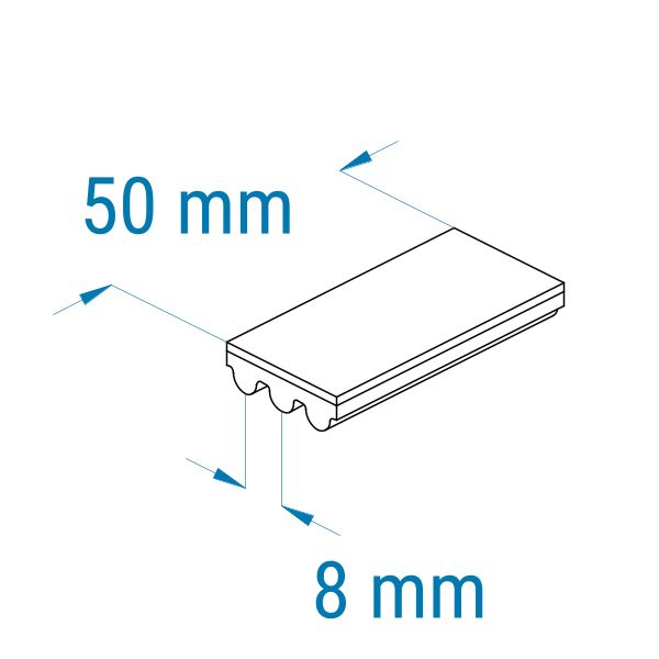 Profil: 8M (HTD) | Breite: 50 mm | Mitnahme: hoch | Oberfläche: Struktur, fein | Abriebfestigkeit: mittel | für Holz, Kunststoffkästen, Kartonagen, Gibtskarton