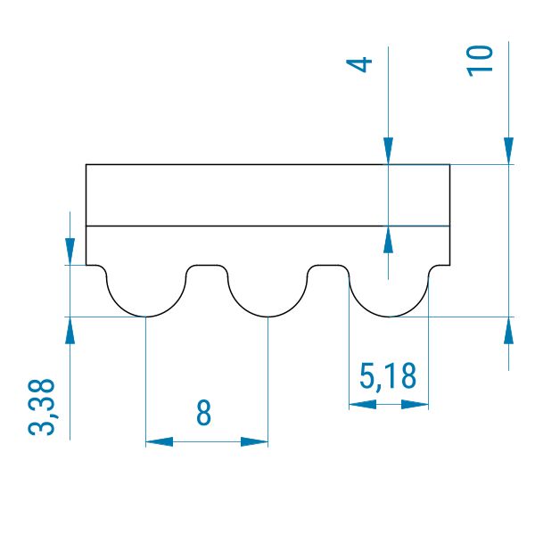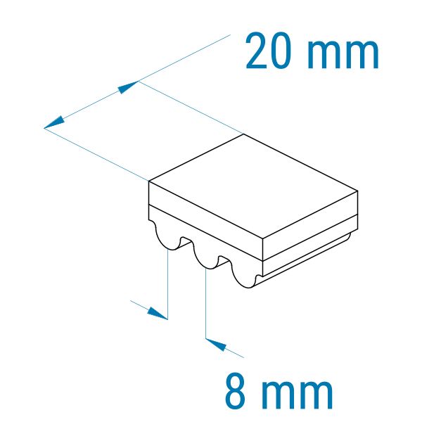 Profil: 8M (HTD) | Breite: 20 mm | Mitnahme: hoch | Oberfläche: glatt | Abriebfestigkeit: niedrig | für Führen, Zentrieren, Anpressen, Etiketten