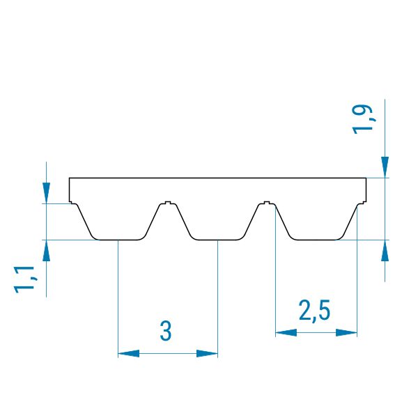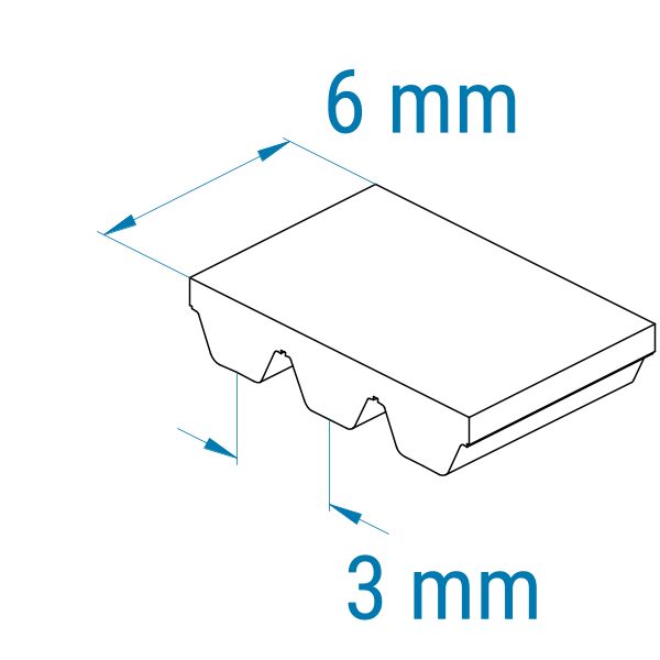 Das AT3-Profil ist trapezförmig. Der Zahn ist bei diesen Riemen wesentlich größer als die Zahnlücke. Aus diesem Grund können sie nicht so klein umgelenkt werden wie Riemen mit einem T-Profil. Der Abstand von Zahnmitte zu Zahnmitte beträgt bei dem AT3-Profil 3 mm.